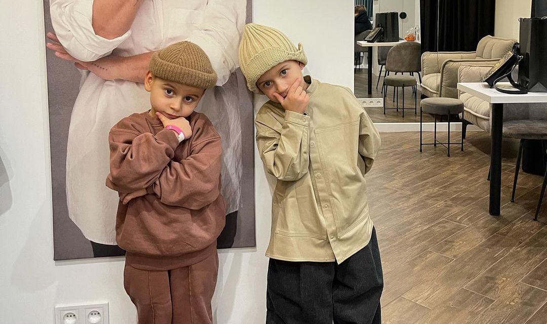 Батьки завжди стильно одягають своїх хлопчиків, і цей раз не став винятком. Старший малюк зображений у широких джинсах та сорочці з коміром-стійкою, а його молодший брат - у модному трикотажному костюмі. На головах у хлопців шапки - схоже, вони успадкували від тата пристрасть до головних уборів.