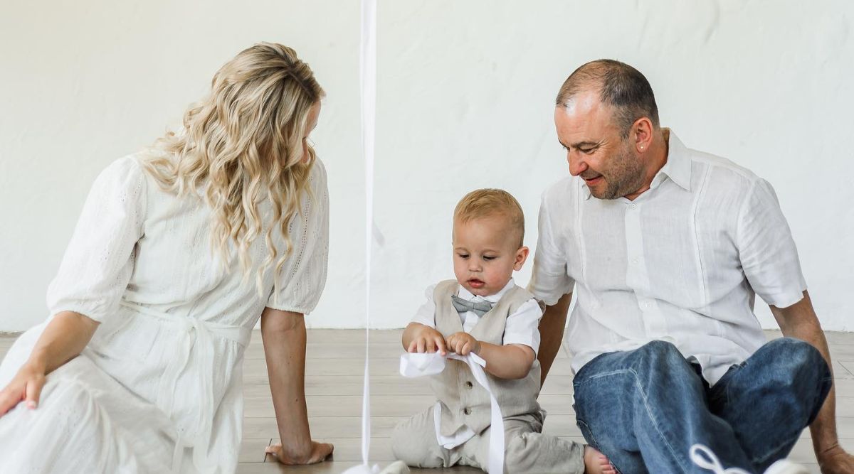 У своєму блозі в Instagram молода мама опублікувала кілька постів, присвячених своєму первістку. На серії сімейних знімків Михасик з"явився у стильному костюмі бежевого кольору, який гармонійно поєднався з білою сорочкою та метеликом сірого відтінку. Батьки обрали вбрання у схожих тонах: Катерина позувала у легкій літній сукні молочного кольору, тоді як Павлік був у класичній білій сорочці, джинсах та білих кросівках.