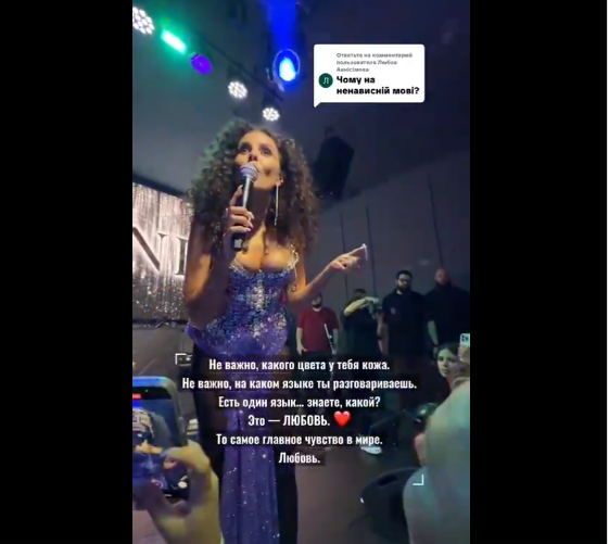 Українська співачка Настя Каменських, яка гастролювала в США з російськомовним репертуаром, під час виступу в Маямі висловилася про мовне питання. Співачка, відкинувши критичне мислення та підтримуючи популярне "какая разніца", заявила: неважливо, якою мовою розмовляє людина, найголовніше - любов.