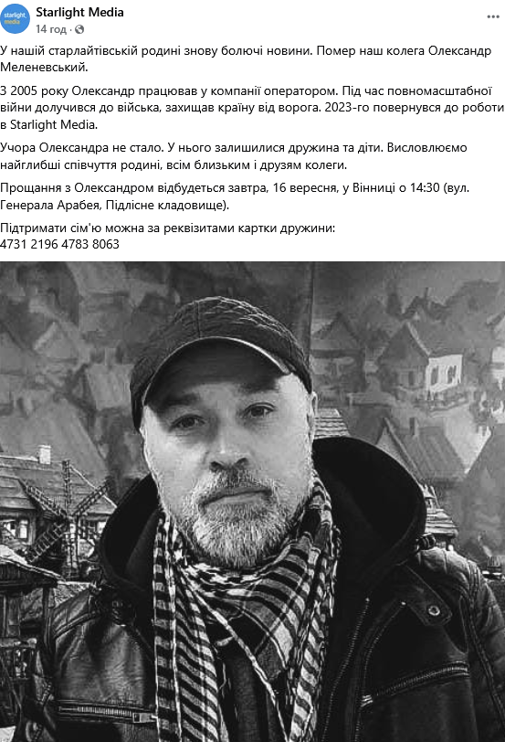 14 вересня помер Олександр Меленевський - оператор Starlight Media, який під час повномасштабної війни боронив Україну на фронті. Йому було 53 роки.