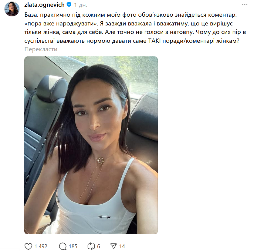 У своєму Threads 39-річна артистка розповіла, що регулярно отримує під дописами поради чи закиди на кшталт "пора вже народжувати". Злата вважає такі зауваження недопустимими, адже рішення стати матір'ю - виключно особиста справа жінки.