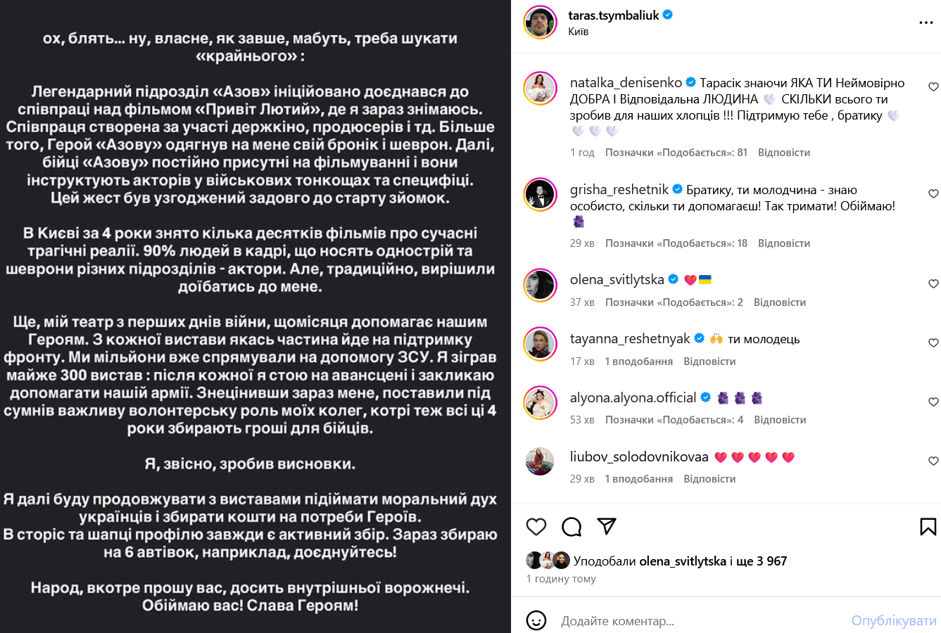 Цимбалюка у коментарях підтримали чимало зіркових колег, зокрема акторки Наталка Денисенко і Олена Світлицька, які разом із актором задіяні у театральних виставах. Слова підтримки також написали ведучий "Холостяка" Григорій Решетнік та співачки Tayanna і alyona alyona.