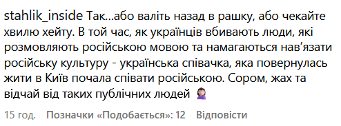"Єва Бушміна в Києві. Щойно в закладі дуже здивувалась російській мові, підкреслено гучній. Заклад такий, що оглянулись всі. А це – Єва, яка ще пару сторіз тому виставляла відео, де вона співає "Убей мою подругу". А ще зовсім нещодавно була на концерті Меладзе. Цікаво, що їй тут знадобилось?", - повідомила інсайдерка.