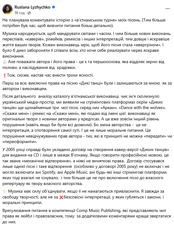 На своїй сторінці у Facebook вона пояснила, що не коментувала історію з "в'єтнамським турне" її пісень одразу, адже мала детально розібратися у ситуації. Та після аналізу пісенного каталогу в'єтнамської співачки Руслана виявила серйозні порушення.