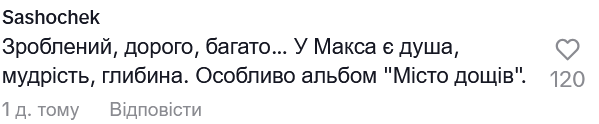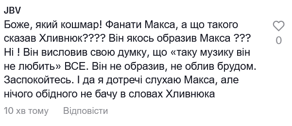 "Я таку музику не люблю. Ну, це Макс Барських - стадіони, мікрофони… Що я скажу? Він лишився собою. Зроблено дорого, багато, все нормально. Просто не люблю саме таку музику. Це міг бути дівчинка, хлопчик, інший виконавець - просто не моє", - висловився Хливнюк.