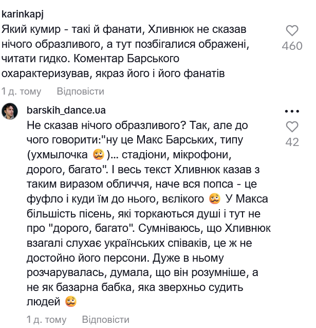 Фрагмент з висловлюванням Хливнюка опублікували на TikTok-сторінці шоу, і саме там Барських залишив короткий, але доволі гострий коментар. "Сидять дві естетки", - написав співак, відреагувавши на оцінку його творчості.