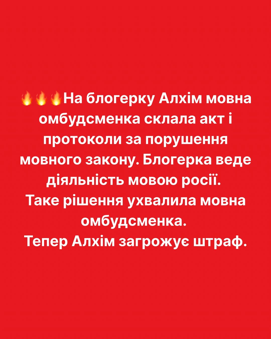 "Блогерка веде діяльність мовою росії. Тепер Алхім загрожує штраф. Таке рішення ухвалила мовна омбудсменка", - висловилася нардепка.