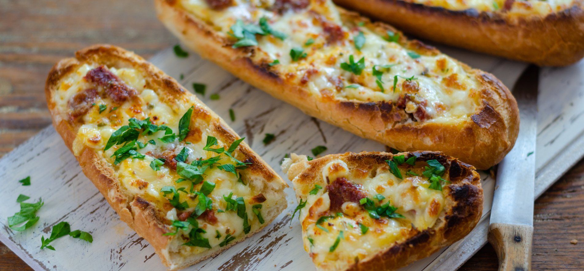 Духовку ззадалегідь розігріваємо до 160°С. Викладаємо багети на деко, вистелене пергаментом, і запікаємо близько 20 хвилин. Потім викладаємо сир та знову ставимо в духовку на 5 хвилин.