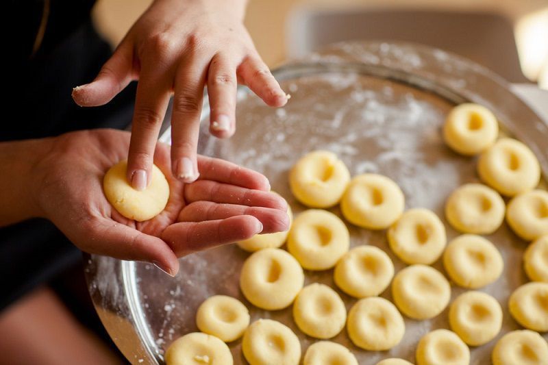 Картоплю треба змішати з 200 г борошна та замісити тісто. З маси потрібно сформувати кульки однакового розміру. Злегка обкачати їх у борошні та зробити невеличку виїмку у кожній кульці.