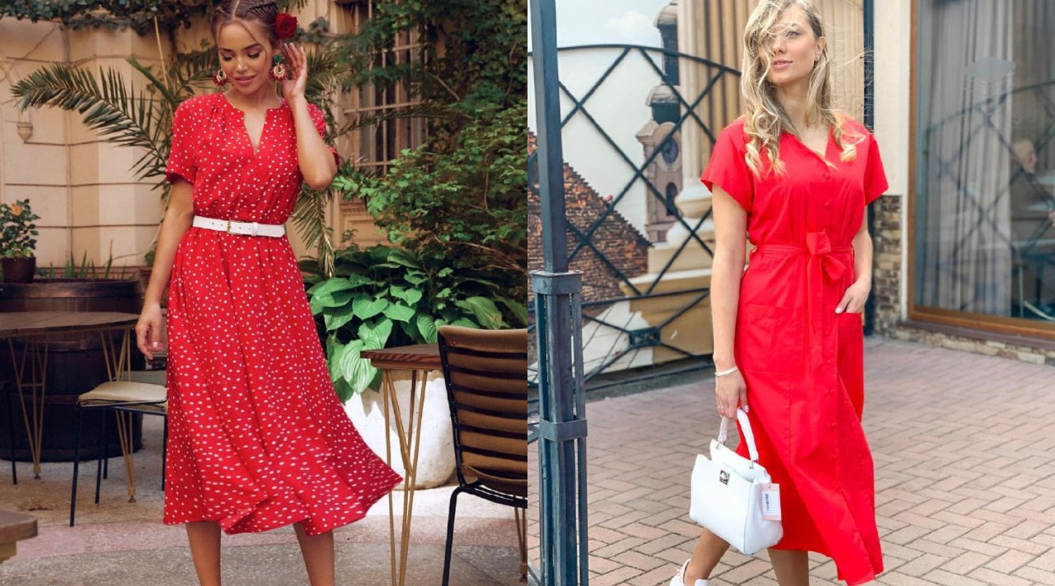Безсумнівно, тренд сезону - червона сукня в горошок. Вибирайте модель у довжині міді, з V-подібним вирізом горловини і з коротким рукавом. Талію можна підкреслити білим ременем і доповнити образ босоніжками на високих підборах, а також масивними сережками.