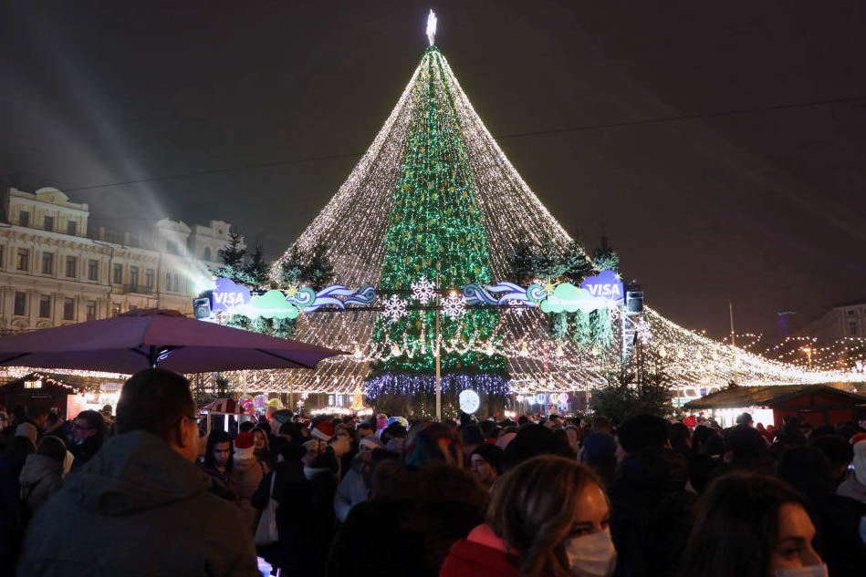 В Україні лок-дауна перед новорічними святами не ввели, тож натовп людей сміливо зібрався біля центральної новорічної ялинки на Софійській площі в Києві.