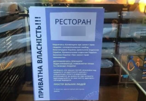 "Дотримуючись принципів недискримінації, поважаючи права і свободи людей, запрошує всіх наших гостей, незалежно від наявності маски або вакцинації, які взяли на себе особисту відповідальність за своє життя і здоров'я...", - написано в оголошенні біля входу.