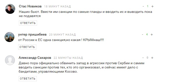 "Наших б'ють. Ввести їм санкції по самі гланди і вводити їх і виводити поки не подавляться", "від Росії до ЄС одна санкція,але яка ! КРИМнаш!!!!", "Давно пора офіційно звинуватити захід у агресії проти Сербії і самим вводити санкції проти тих, хто це організував, і зараз має справу з бандитами, керуючими Косово", - пишуть у коментарях під цією новиною користувачі на сайті Lenta.ru.