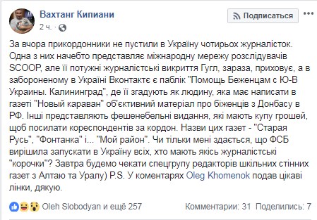 "За вчора прикордонники не пустили в Україну чотирьох журналісток. Одна з них начебто представляє міжнародну мережу розслідувачів SCOOP, але її потужні журналістські викриття Гугл, зараза, приховує, а в забороненому в Україні Вконтактє є паблік "Помощь Беженцам с Ю-В Украины. Калининград", де її згадують як людину, яка має написати в газеті "Новый караван" об'єктивний матеріал про біженців з Донбасу в РФ. Інші представляють фешенебельні видання, які мають купу грошей, щоб посилати кореспондентів за кордон. Назви цих газет - "Старая Русь", "Фонтанка" і... "Мой район". Чи тільки мені здається, що ФСБ вирішила запускати в Україну всіх, хто мають якісь журналістські "корочки"? Завтра будемо чекати спецгрупу редакторів шкільних стінних газет з Алтаю та Уралу)", - іронічно вказав він.