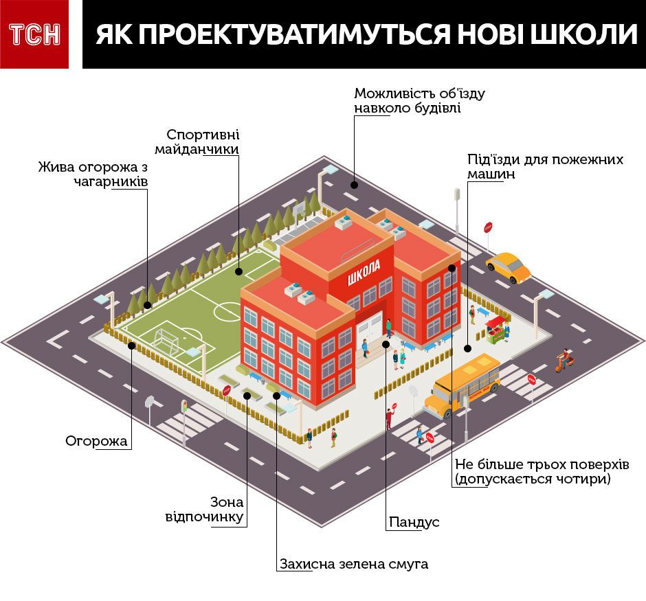 За новими стандартами сучасні школи матимуть: пандуси, захисну зелену смугу (дерева, кущі, газон) завширшки не менше 1,5 м, а з боку вулиць – не менше ніж 3 м, огорожу заввишки не менше ніж 1,2 м, під’їзди для пожежних машин до будівель, можливість об'їзду навколо будівлі, а також відкриті ділянки для стоянки автомобілів.