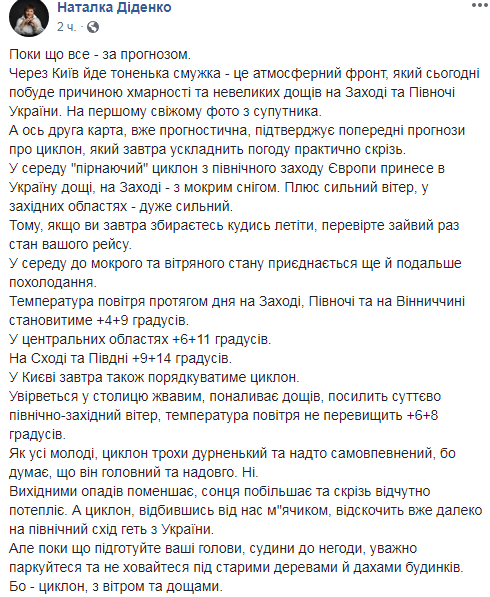 Про це повідомляє синоптик Наталія Діденко на своїй сторінці в Facebook.