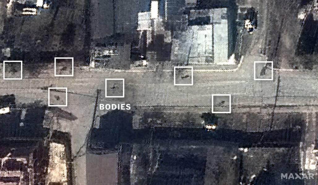 У Бучі Київської області багато мирних жителів були вбиті близько трьох тижнів тому, коли місто перебувало під контролем російських військових. Про це свідчать супутникові знімки.