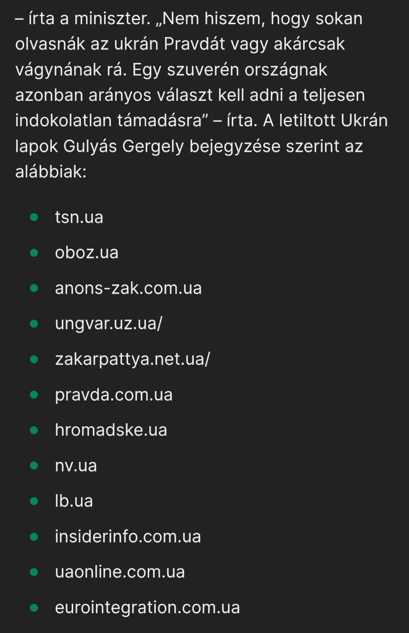 "Україна, яка прагнула вступити до Європейського Союзу, заблокувала іноземні, в тому числі угорські, новинні інтернет-сайти за те, що вони наважувалися критично писати про політику санкцій проти Росії, про збройну підтримку України, а також зображувати Європейський Союз і НАТО як фрагментовані і неефективні. Сьогодні Угорщина, дотримуючись принципу взаємності, запроваджує дзеркальні заходи проти українських новинних порталів, щоб вони не були доступні на території Угорщини", — йдеться у дописі.
