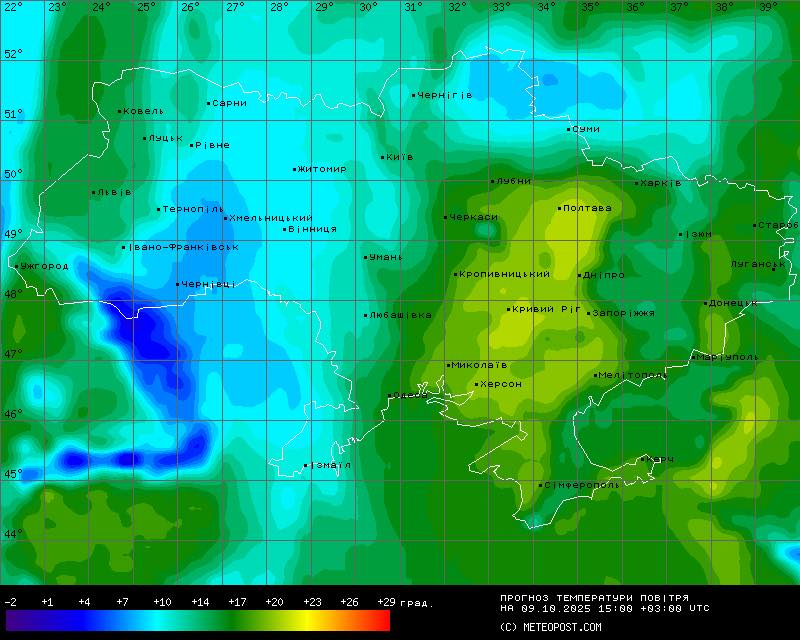 Впродовж дня температура повітря в Україні коливатиметься в межах +10+13 градусів, при цьому найтепліше буде в межах смуги атмосферного фронту від Одещини до Полтавщини: там очікується +14...19 градусів. На Тернопільщині, Хмельниччині, у Чернівецькій області та в Карпатах подекуди буде нижче +10 градусів.