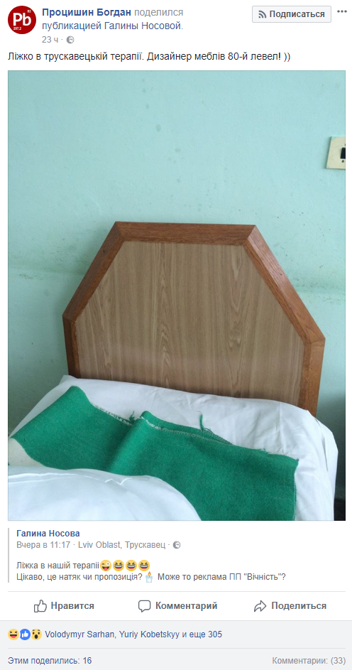 У мережі активно обговорюють фотографію ліжка з "могильним" дизайном у лікарні Трускавця Львівської області.