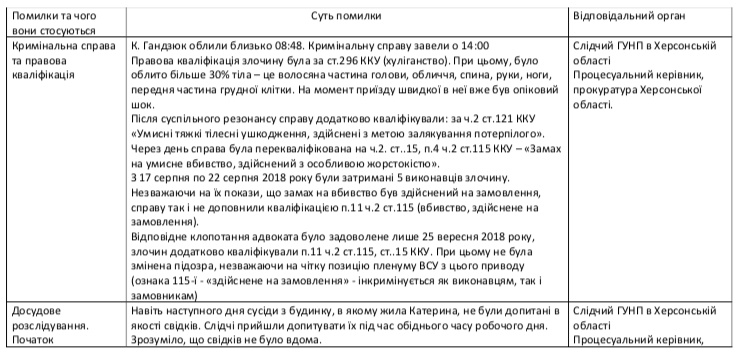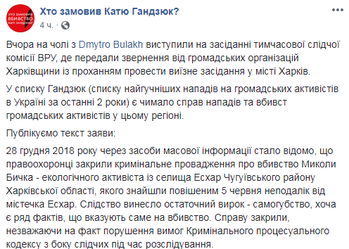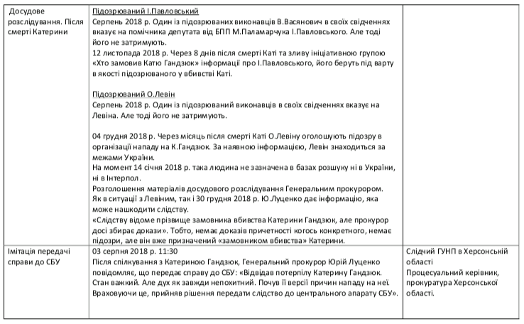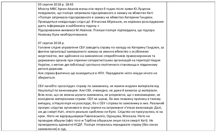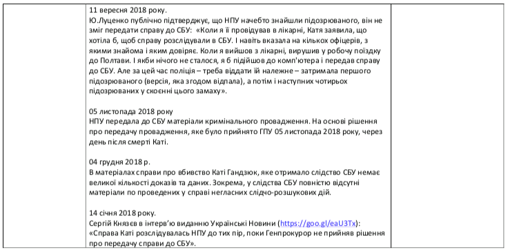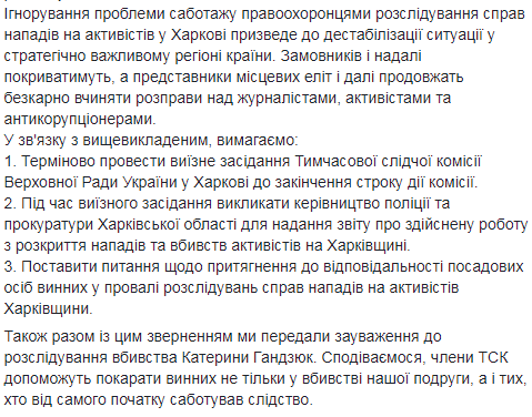 "Також разом з цим зверненням ми передали зауваження до розслідування вбивства Катерини Гандзюк. Сподіваємося, члени ТСК допоможуть покарати винних не тільки у вбивстві нашої подруги, а й тих, хто з самого початку саботував слідство", - йдеться в повідомленні.