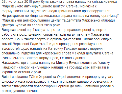 26 листопада 2018 була закрита справа нападу на співзасновника "Харківського антикорупційного центру" Євгенія Лисичкина з формулюванням "відсутність події кримінального правопорушення".