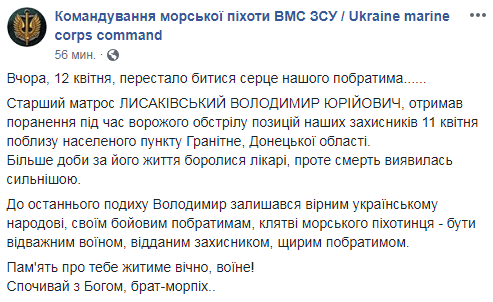 "Більше доби за його життя боролися лікарі, проте смерть виявилася сильнішою. До останнього подиху Володимир залишався вірним українському народові, своїм бойовим побратимам, клятві морського піхотинця - бути відважним воїном, відданим захисником, щирим побратимом", - зазначили у ЗСУ.