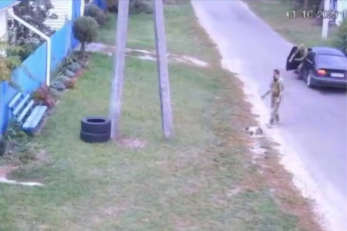 На кадрах видно, що один із чоловіків підходить до кота, який гуляв вулицею, піднімає його та забирає до авто. Після цього чоловіки поїхали геть