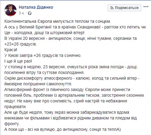 Про це на своїй сторінці в Facebook повідомила синоптик Наталка Діденко.