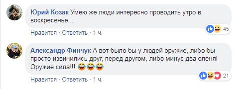 "А ось якби була б у людей зброя, або б просто вибачилися один, перед другом, або мінус два оленя! Зброя сила!" - пишуть в мережі.