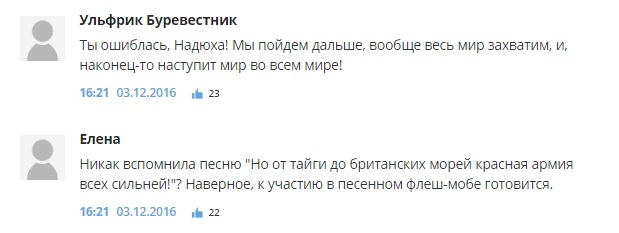 У росіян викликала бурхливу реакцію заява народного депутата України Надії Савченко про те, що, якщо західні країни не втрутяться у війну на Донбасі і зупинять Росії, її вторгнення може дійти до Великобританії.