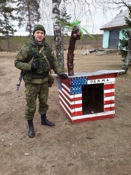 У соціальних мережах підняли на сміх фотографію, на якій зображений військовий з РФ поряд з будкою, яка пофарбована в кольори американського прапора і з написом "Обама".