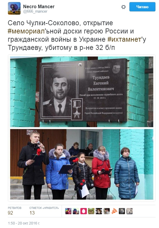 Судячи з фото і скріншоту публікації блогу на LiveJournal, старший лейтенант Збройних сил Росії Євген Трундаев 1986 року народження, якому в РФ встановили меморіальну табличку і нагородили званням героя посмертно, був інструктором у бойовиків так званої ЛНР. Він загинув 15 жовтня 2014 року на Донбасі.