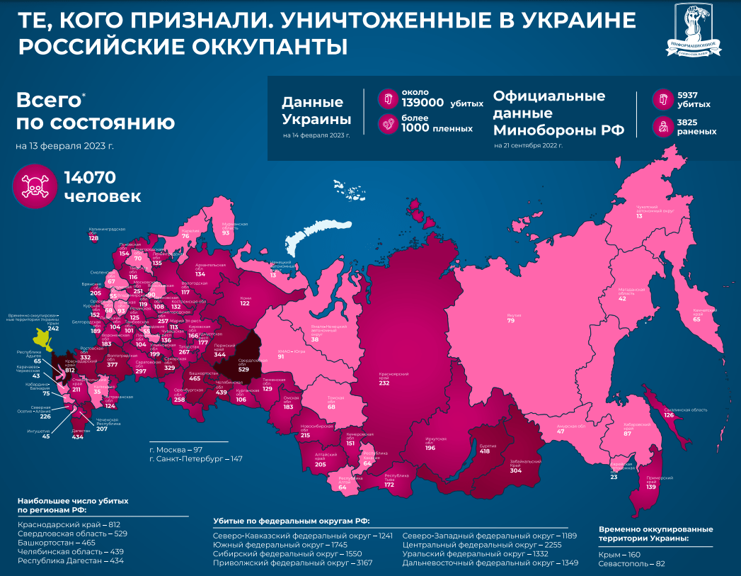 Владні органи з різних регіонів Росії станом на 13 лютого визнали, що на війні проти України загинули щонайменше 14 070 окупантів. Тим часом Міноборони РФ припинило публікувати інформацію про свої втрати ще восени минулого року. Останнє оновлення там датується 21 вересня з кількістю втрат у кількості 5 937 загарбників.