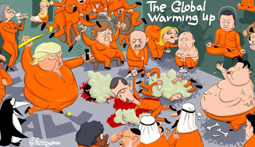 Над малюнком розміщено іронічний напис "глобальне потепління", що підкреслює напруження політичної ситуації у світі.