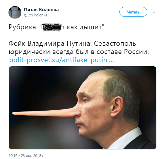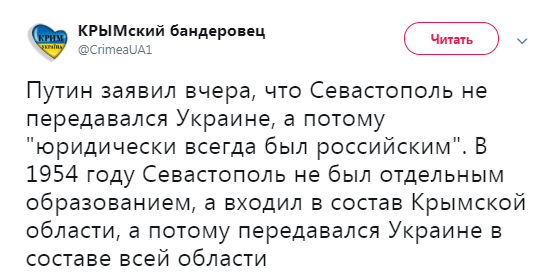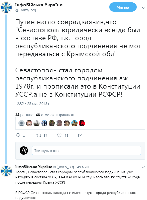 "Путін нахабно збрехав, заявивши, що "Севастополь юридично завжди був в складі РФ, бо місто республіканського підпорядкування не могло передаватися з Кримської обл "Севастополь став містом республіканського підпорядкування аж 1978 р, і прописали це в Конституції УРСР, а не в Конституції РРФСР!", - пишуть "ІнфоВійська України".