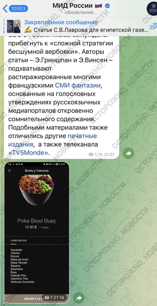 Публікацію майже відразу ж було видалено, але за допомогою цього посту можна дізнатися про смакові уподобання російських дипломатів. І це явно не парена ріпа та щі з чорним хлібом. Так, автор публікації додав у кошик поке з яловичиною, авокадо, руколою та бобами едамамі. Це частування, яке коштує 13 євро, замовляли з іспанського ресторану "Sushi Shop", чиї ресторани знаходяться також у Барселоні, Валенсії, Мадриді.