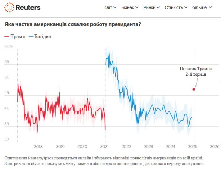 Таку думку висловив український журналіст Юрій Ніколов, опублікувавши опитування Рейтерс щодо схвалення роботи колишнього президента США Джо Байдена та нового, Дональда Трампа.