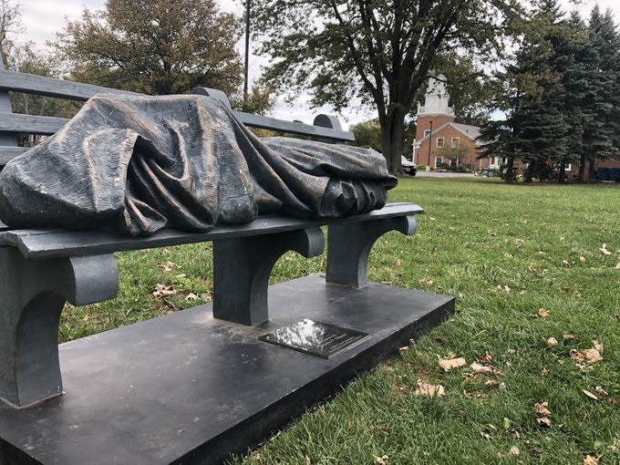 Скульптурна композиція, яка називається "Бездомний Ісус" і являє собою людину, що зіщулилася в тонкому одязі на лавці в сільському парку, звернула на себе увагу уважного перехожого. Він запідозрив, що хтось із бездомних порушує правопорядок, ночуючи таким чином в парку, і викликав на місце події поліцію.