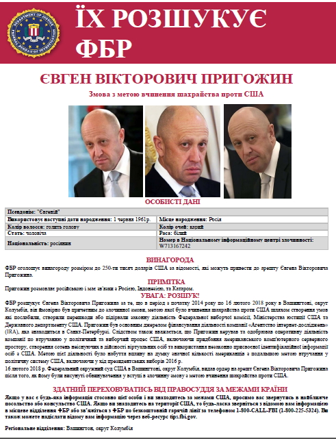 Чверть мільйона доларів будуть передані особі, що надасть інформацію про Пригожина, яка надалі допоможе притягти її до відповідальності.