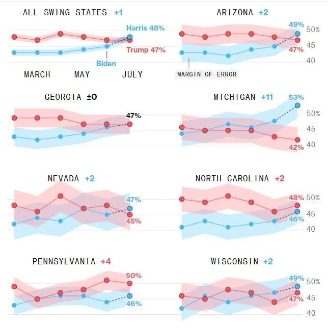 В опитуванні йдеться про те, за кого б проголосували американці, "... якби вибори президента США в листопаді 2024 року відбувалися сьогодні". Гарріс здобула більшу прихильність в Аризоні (49% за Гарріс, проти 47% за Трампа), Вісконсіні (50% проти 47), Мічигані (53% проти 42%) та Неваді (47% проти 45%).