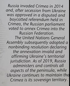 У поясненні в атласі йдеться про те, що Росія вторглася у Крим у 2014 році, а потім "приєднала" його до РФ. Незаконний референдум вказується як "спірний" та "бойкотований".