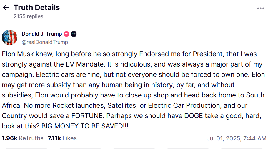 "... Ілон, можливо, отримує більше субсидій, ніж будь-яка людина в історії, і без них йому, ймовірно, довелося б закрити бізнес і повернутися додому, в Південну Африку. Більше не буде запусків ракет, супутників або виробництва електромобілів, і наша країна заощадить величезний статок. Можливо, нам слід попросити DOGE уважно придивитися до цього? Можна зекономити багато грошей!!!", – пише Трамп.