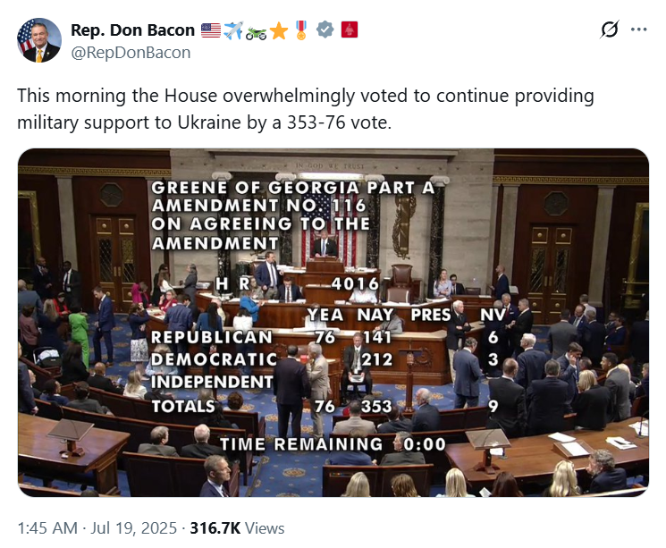 Про це повідомив конгресмен від штату Небраска Дон Бейкон у соцмережі Х.
