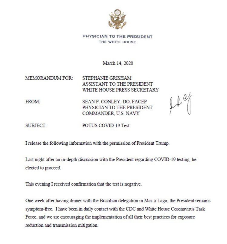 "Вчора ввечері після того, як я детально обговорив з президентом тестування на COVID-19, він вирішив його зробити. Сьогодні ввечері я отримав підтвердження, що тест дав негативний результат", - йдеться в заяві лікаря.