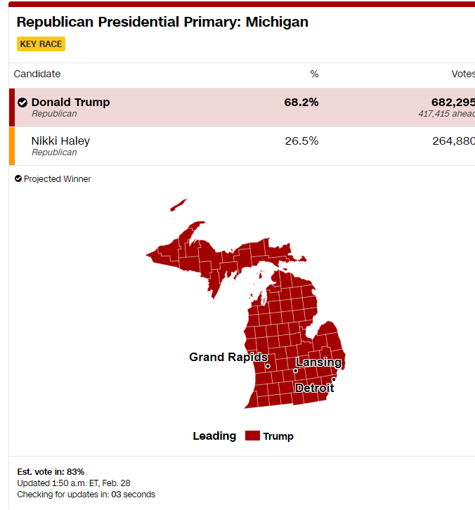 Зокрема на інфографіці можна помітити, що в Мічигані від Республіканської партії Дональд Трамп набрав 68,2% голосів. Натомість Ніккі Гейлі, колишня губернаторка Південної Кароліни та головна опонентка Трампа, набрала 26,5%. Розрив між конкурентами наразі становить 417 415 голосів.