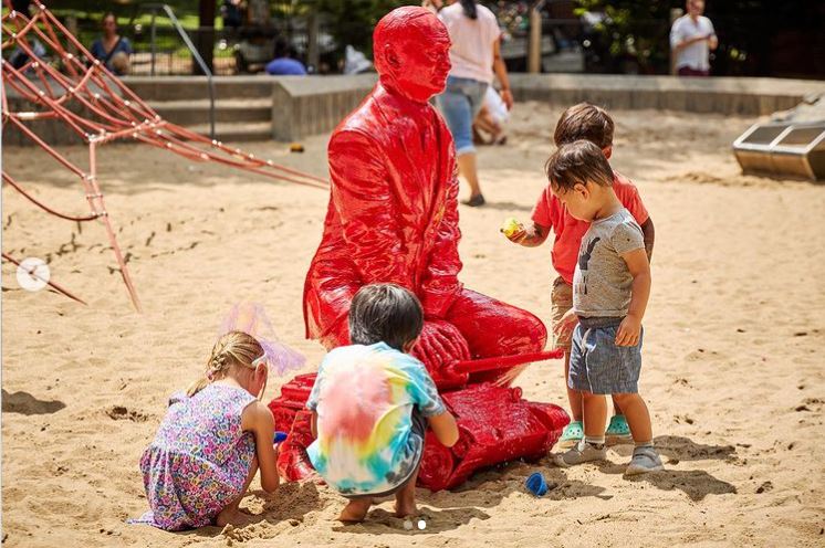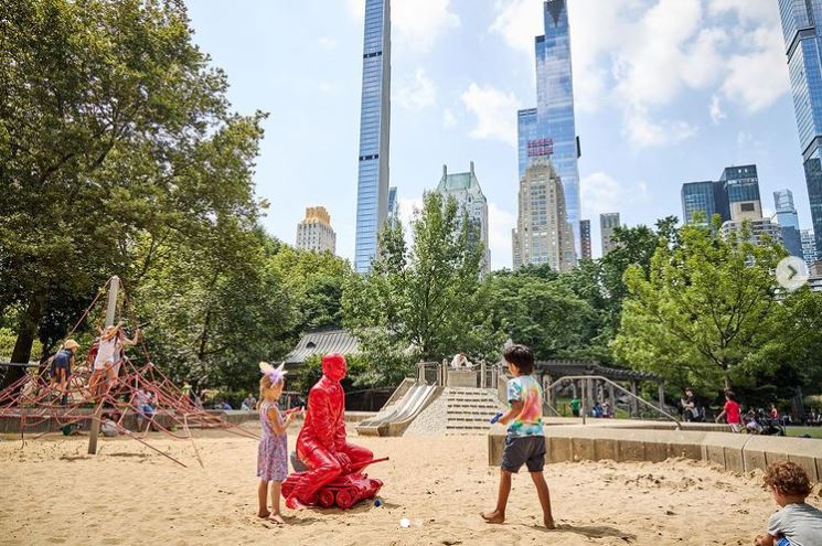Червону скульптуру, яка зображує президента Росії Володимира Путіна, посадженого на іграшковий танк, було встановлено на дитячому майданчику у знаменитому Центральному парку Нью-Йорка.