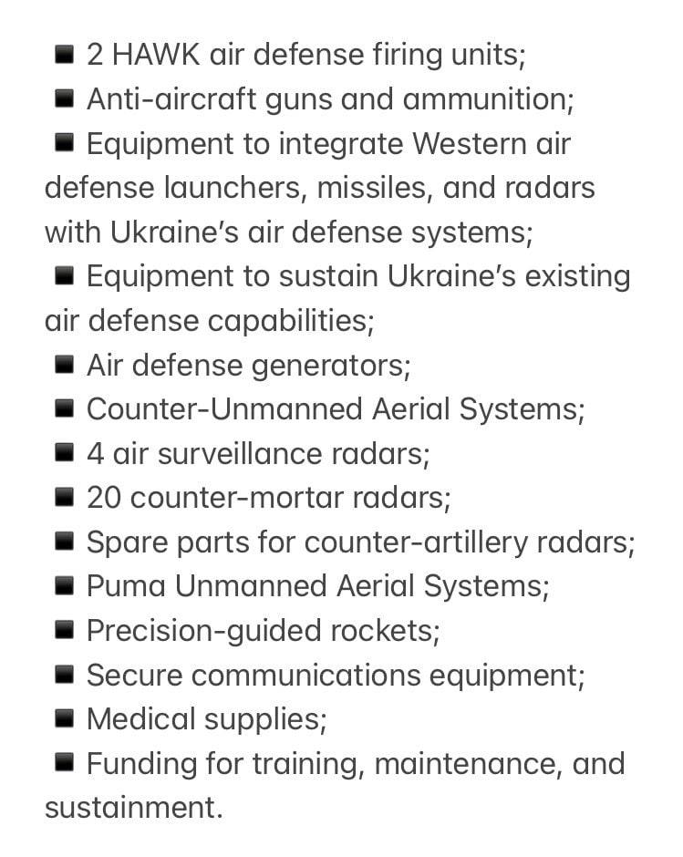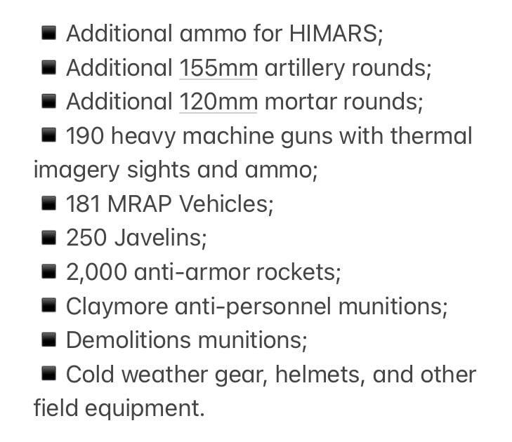 За його словами, новий пакет включає протитанкові ракети Javelin, артилерійські боєприпаси, а також звичайні та далекобійні ракети для HIMARS.