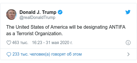 Президент США Дональд Трамп жорстко відреагував на події, поклавши відповідальність за заворушення в Міннеаполісі на "радикальних лівих анархістів". Він запевнив, що рух "Антифа" визнають терористичною організацією.