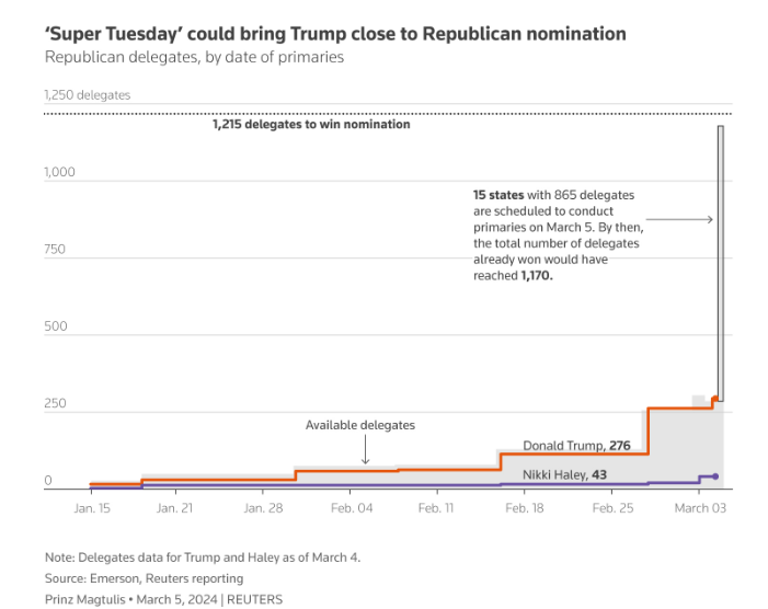 Зазначається, що Дональд Трамп здобув перемогу в багатьох штатах, зокрема і в Каліфорнії та Техасі, відсунувши кандидатуру єдиної опонентки – Ніккі Гейлі. Вона, за прогнозами Edison Research, здобула єдину перемогу в штаті Вермонт. Також відомо, що вона не з'являлася на публіці у вівторок, а її компанія не запланувала жодних майбутніх заходів.